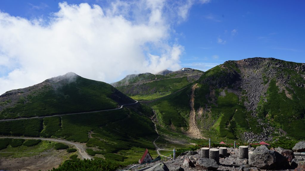 畳平から降りて、円状になっている道が見えますが、あれが「お花畑」です。写真右側のピークが「魔王岳(2,764m)」。その、左側のもっと高い山が「恵比寿岳(2,831m/ガレていて登れません)」。