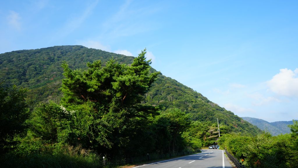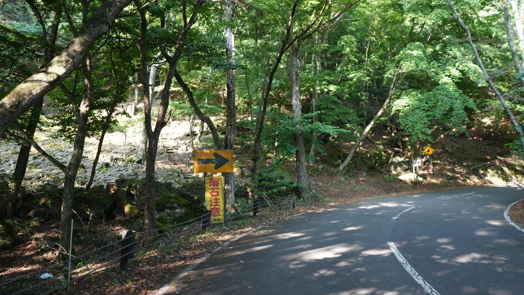 少し進んで、木陰に入って、すぐ。左側に階段が見えるでしょうか?あそこが登山口です。