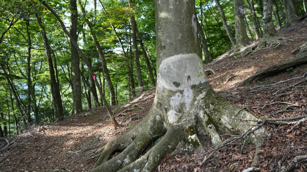 つづら折りの道を黙々と登ります。。。お!?木にハート型の模様が!!恋人の聖地にしようぜ!!