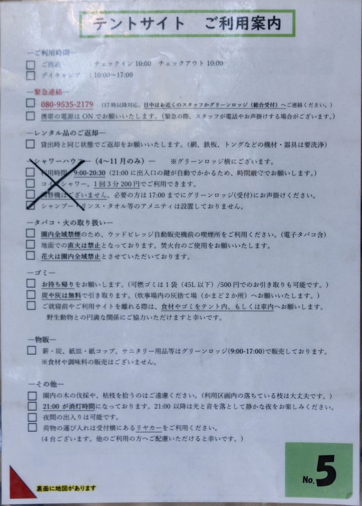 決めた場所を告げると、先ほど受けた説明と地図のある利用案内のパウチを渡されます。チェックアウト時に返却するので、失くさないように。