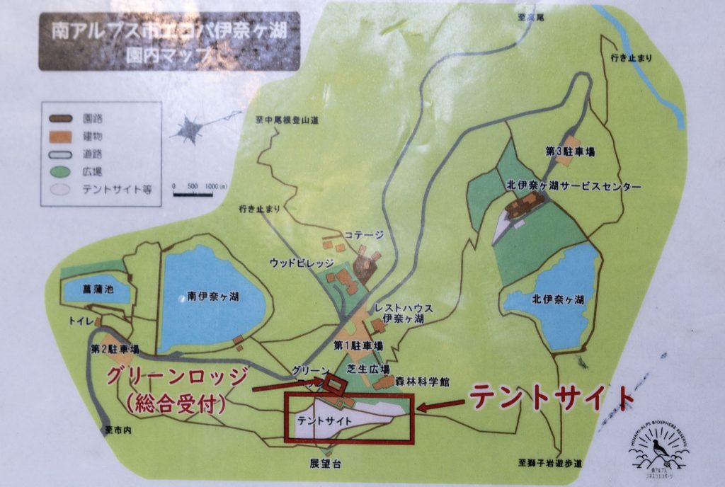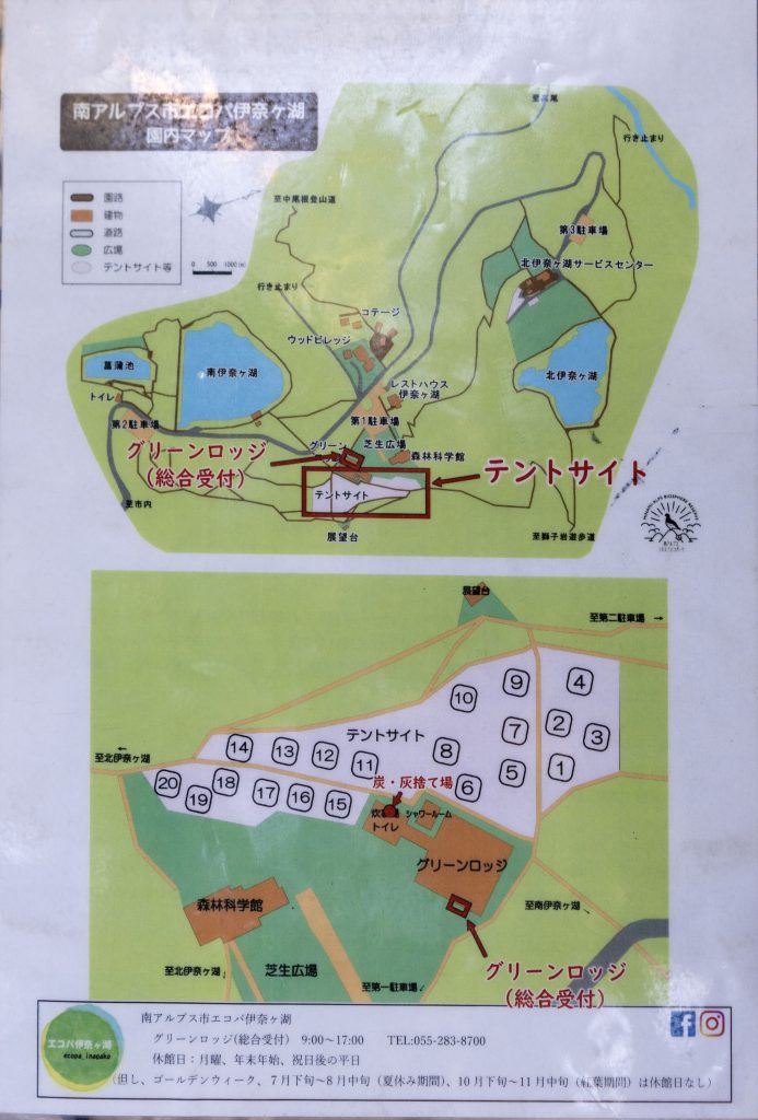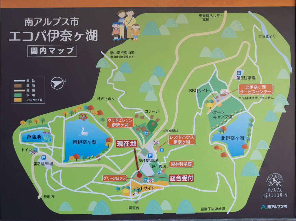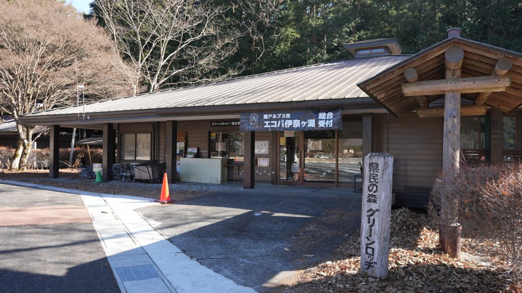 園内には南伊那ヶ湖、北伊那ヶ湖があり、それらに挟まれる位置に総合受付の「グリーンロッジ」があります。