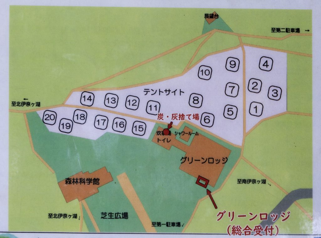 グリーンロッジ周辺にはレストランや森林科学館、そして今回宿泊したテントサイトがあります。