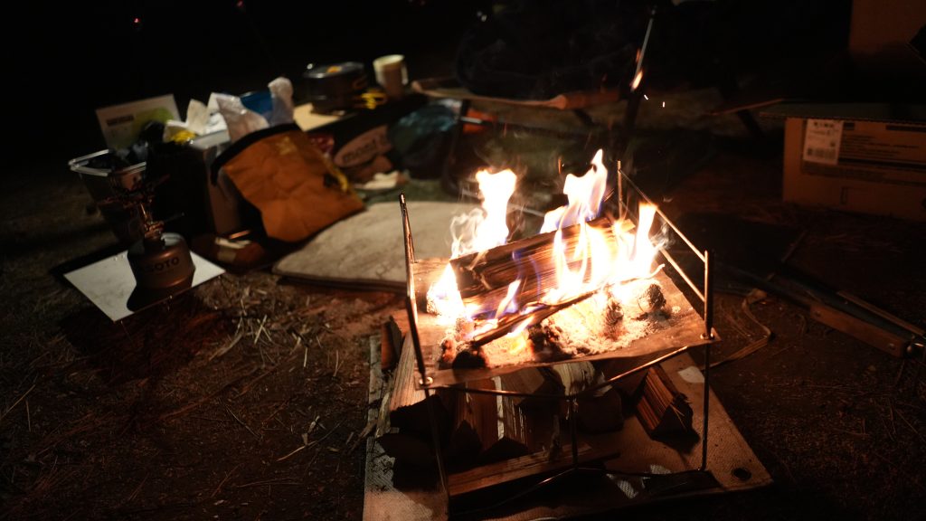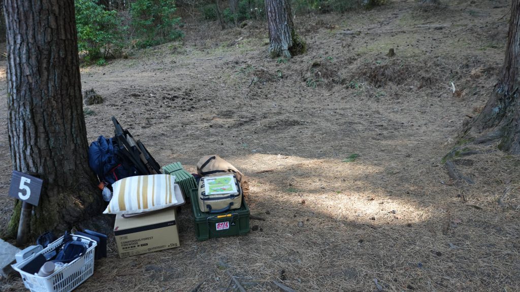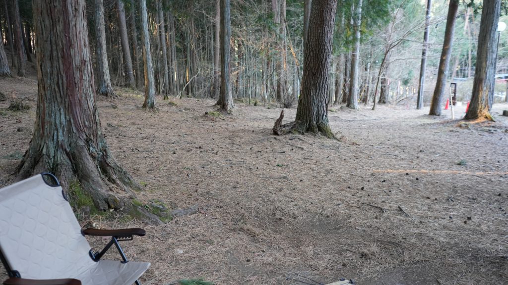そして、針葉樹の枯れ葉が多いです。焚火台の周りの枯れ葉を取り除く事。あと、ギア類を置くスペースにはなるべく「シート」を敷く事もオススメします。
