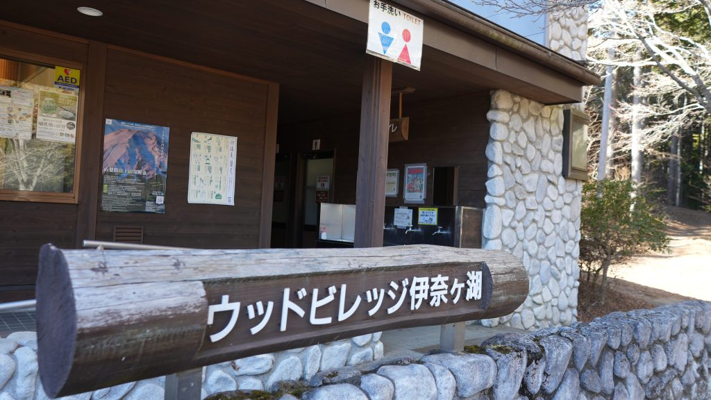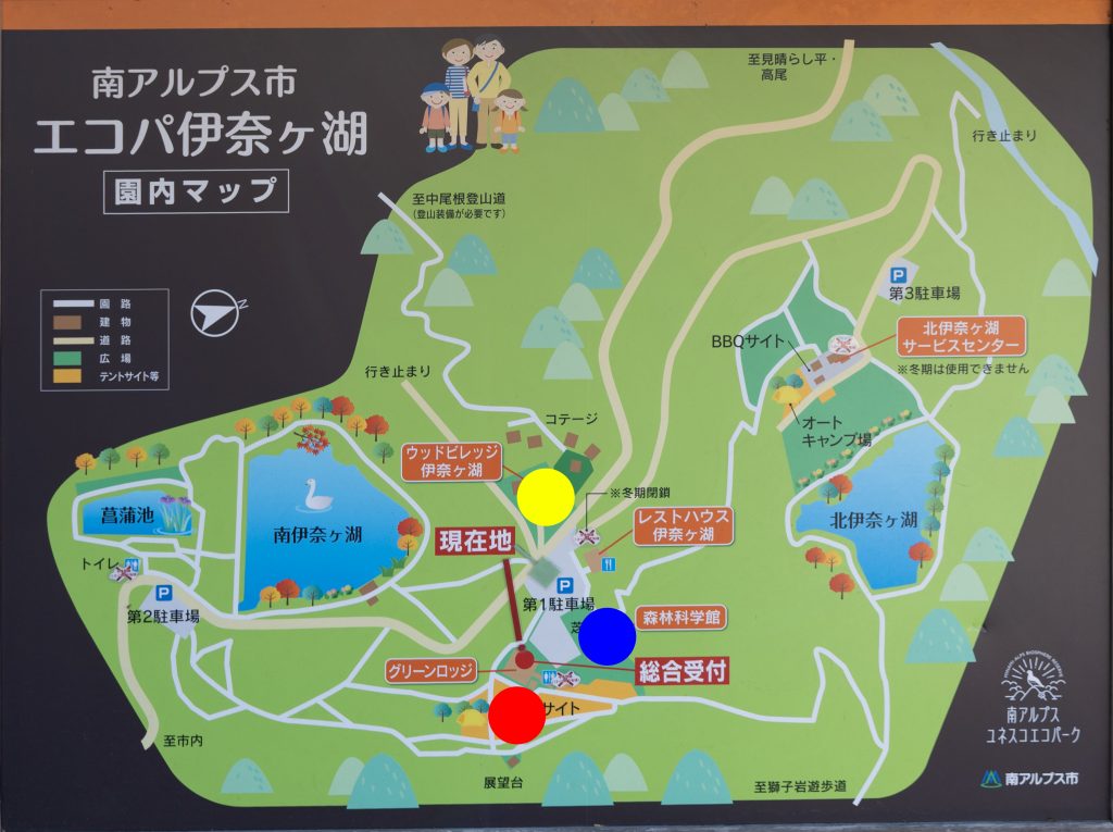 そのため、トイレは「森林科学館(青丸)/9時~17時」と「ウッドビレッジ伊那ヶ湖(黄丸)/24時間利用可能」のトイレを使う事になります。
