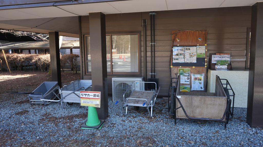 テントサイトには車やバイクを入れられません。荷物はリヤカーを借りて運びます。