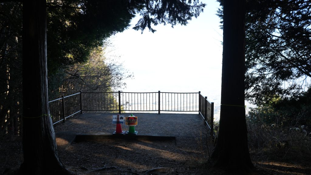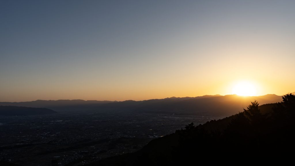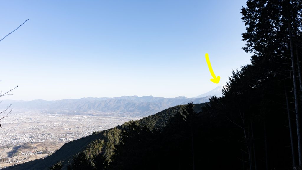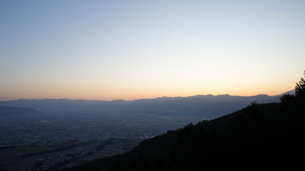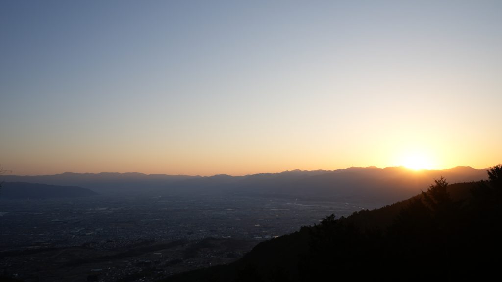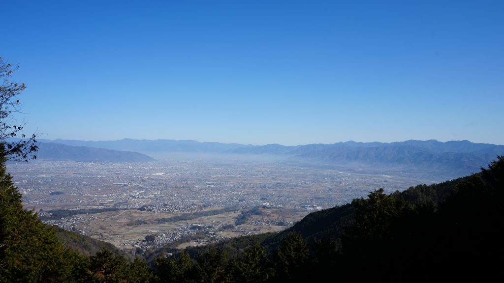 甲府盆地を見渡す絶景!方角的に、写真右から御坂山地~大菩薩嶺~秩父山塊が遠目に見えます。もうちょっと右(南)の方を見ると、ちらっと富士山が見えます。