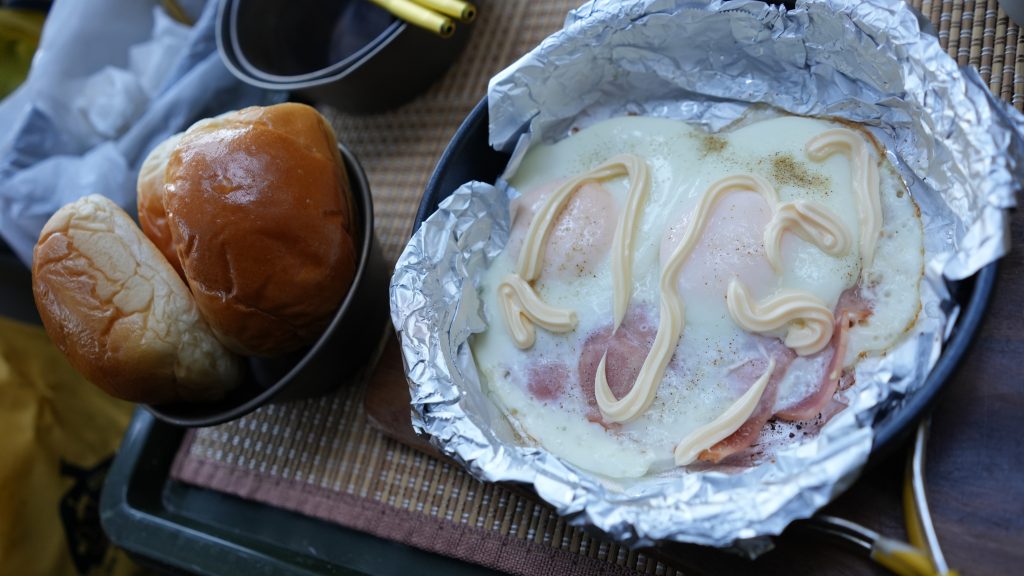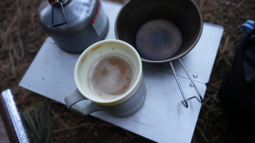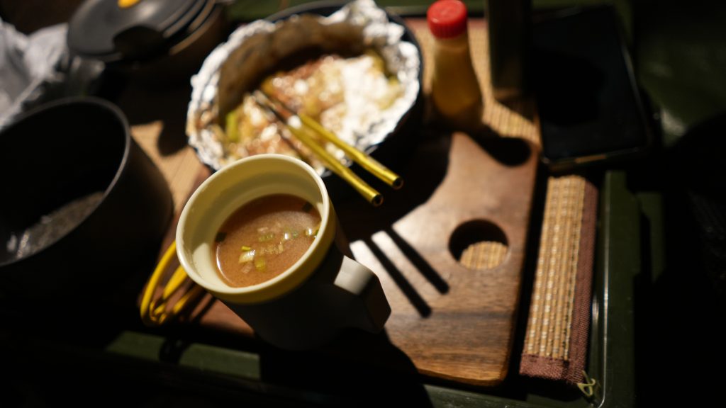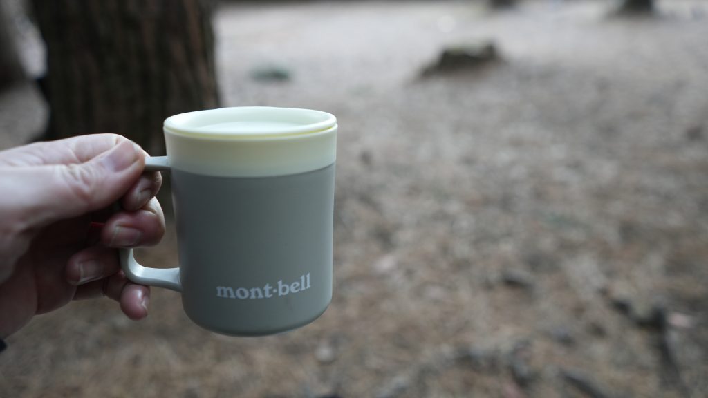 このコップは今回からのニューギア!モンベルの「サーモマグ」!味噌汁入れてます。蓋もあるので、閉めるとかなりの時間、温度を維持してくれました(^^)/。容量は200ml。一般的にコーヒー一杯分は180ml位なので、丁度良いです。