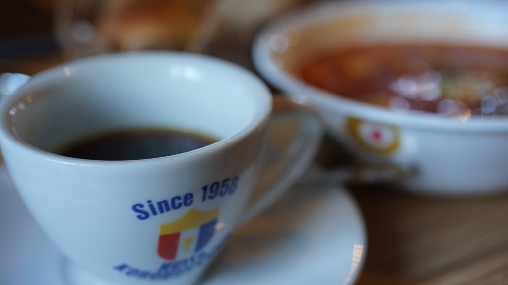 しまリンがキャンプ場に行く道中で寄り、ボルシチとキャラメルマキアートを頼んでいました。寒い日の設定だったので、店内で。「寒い日のボルシチうまー」。