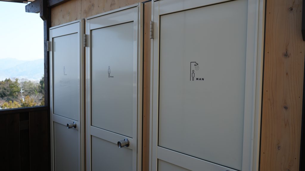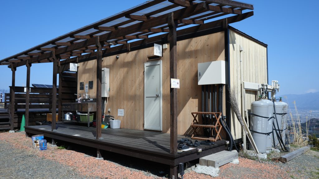 キャンプサイトとウッドデッキの間に、トイレなどがあります。