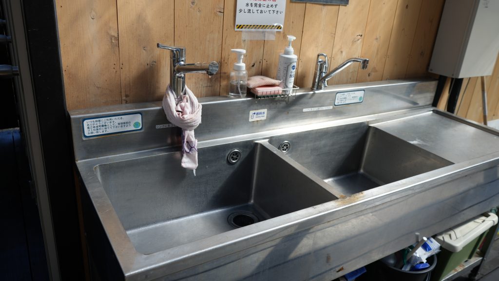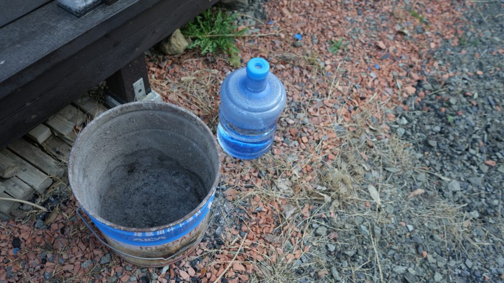 また、水場の前に灰捨て用の缶が置いてあります。消火用の水(ですよね?)も置いてあって至れり尽くせり。ですが、なるべく完全消化してから捨てたいですね。