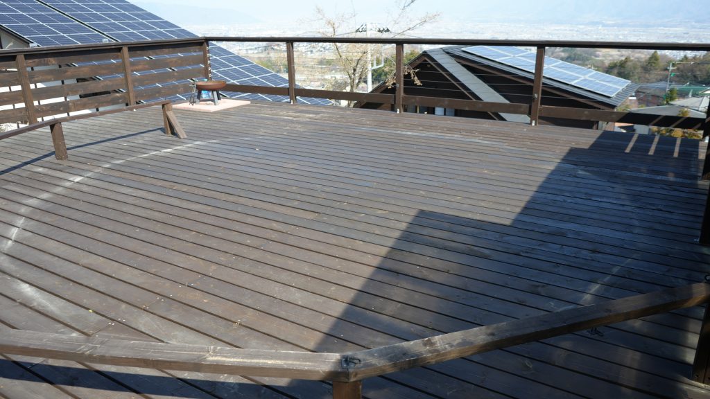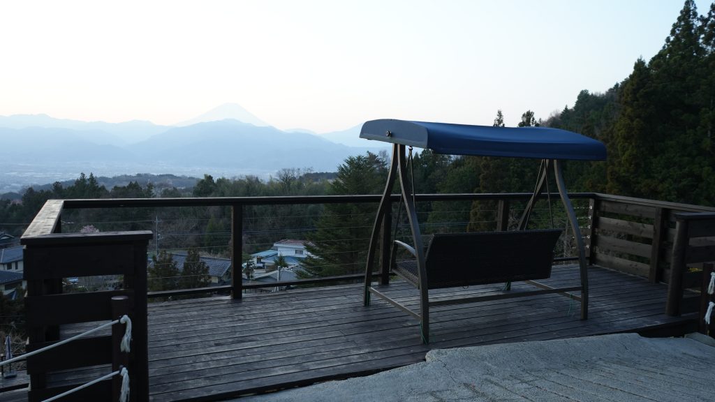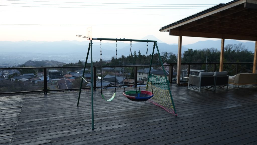 ウッドテラスにベンチ…ではなく、ブランコが設置されています。。。エモい( ゚Д゚)。