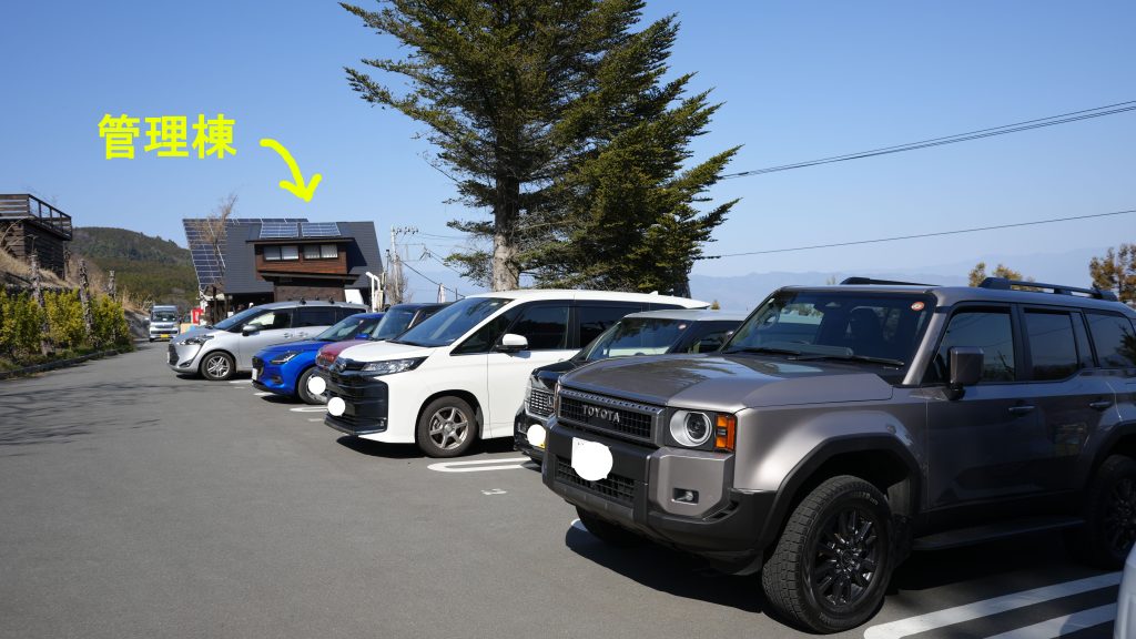 オートキャンプやグランピングの方は受付後、移動してサイト内や隣に駐車可能ですが、横付け不可のキャンプサイトの場合、ここに駐車したままになります。