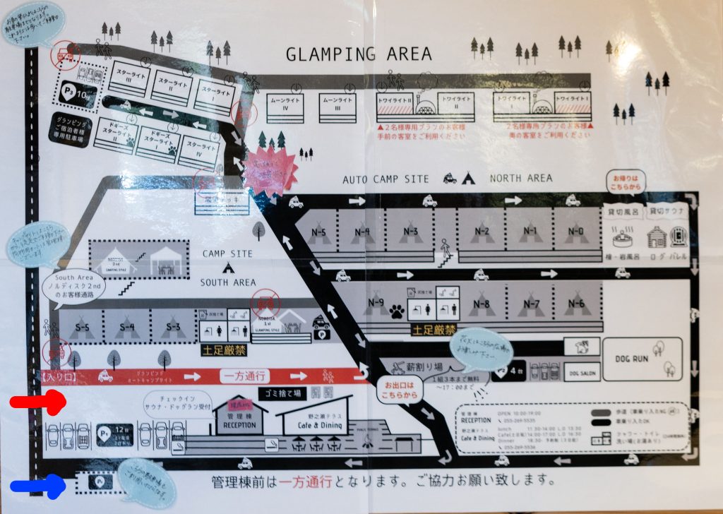場内は道が狭い上に坂道。そして一方通行が多いです。青い矢印から入ると、間違いに気づいてから退場するのが一苦労でした(^^ゞ。