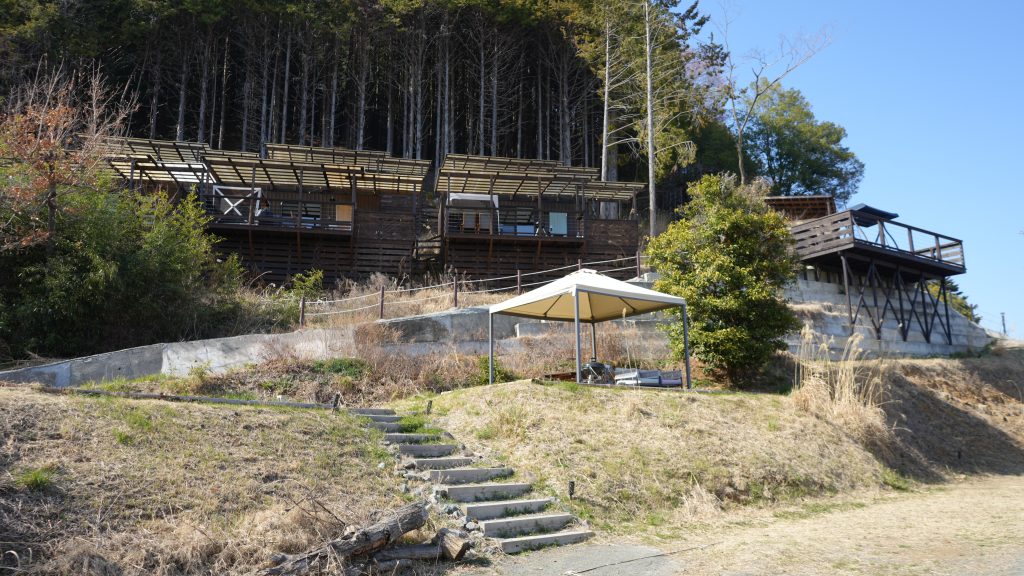 これは↑自分のサイトからの写真ですが、グランピングは高台のエリアにあります。コテージのような建物が高台に並んでいますが、あれらがそうですね。