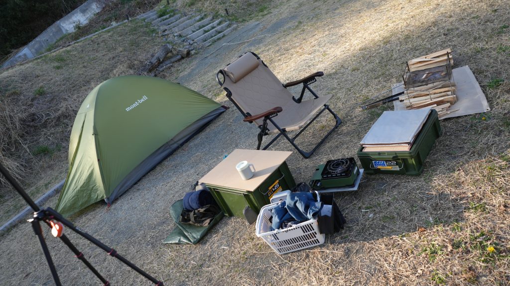 ただ、冬という季節だったからか、地面の枯草がギアにくっ付いてくるので、直接地面に置く時は気を付けて下さい。