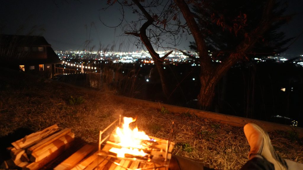 さすがに夜は冷えます。焚火を傍らに、足を投げ出し、夜景を眺めます。