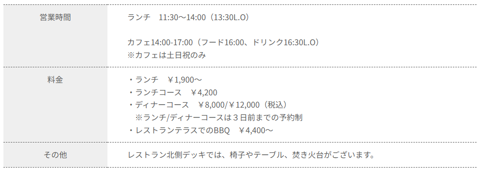 | 定休日 | 不定休 レストランは毎火曜日+第2第4水曜日 (カフェ営業は土日祝のみ) |