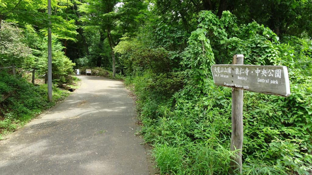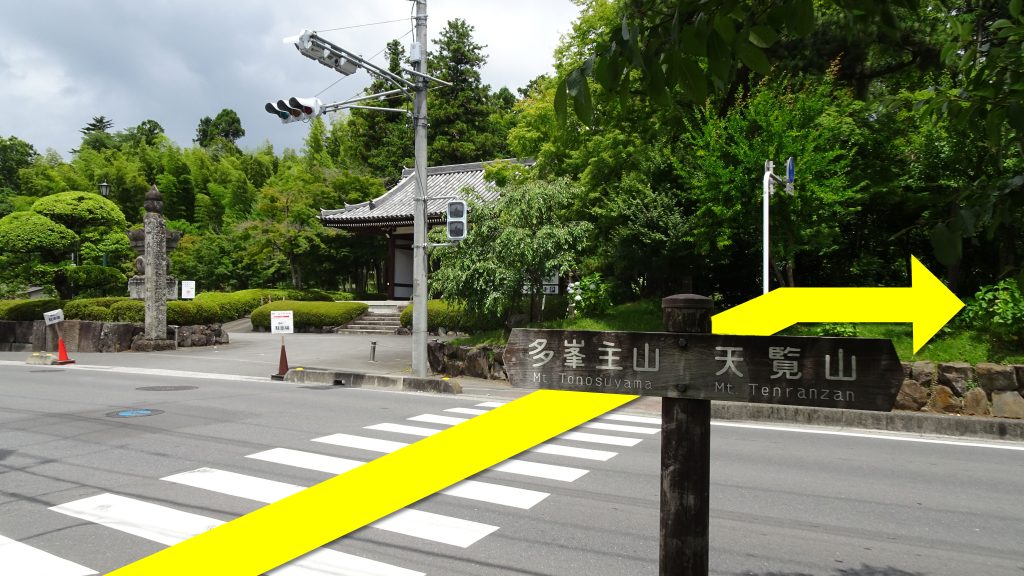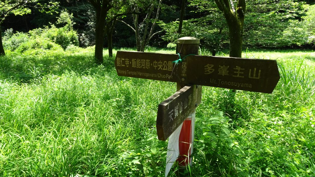 能仁寺前の交差点には山への案内標識があります。左に行くと、天覧山を通らず、多峯主山へ行けます(下りに利用したルートです)。