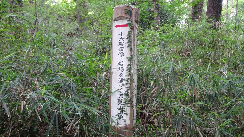 左は「十六羅漢像」と岩場を通って、山頂に行くルート。右はそれらを経由せず、山頂へ行ける巻道です。せっかくなので、左へ。