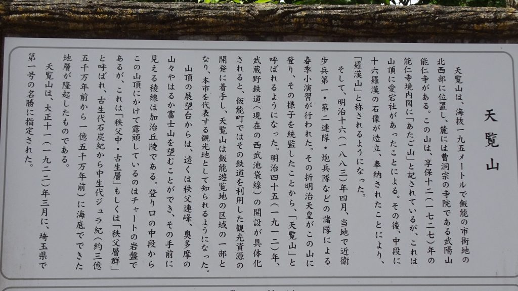 天覧山は、古くは愛宕山、羅漢山と呼ばれていたのですが、1,883年、明治天皇がこの山頂から視察したことから、この名が付いたそうです。