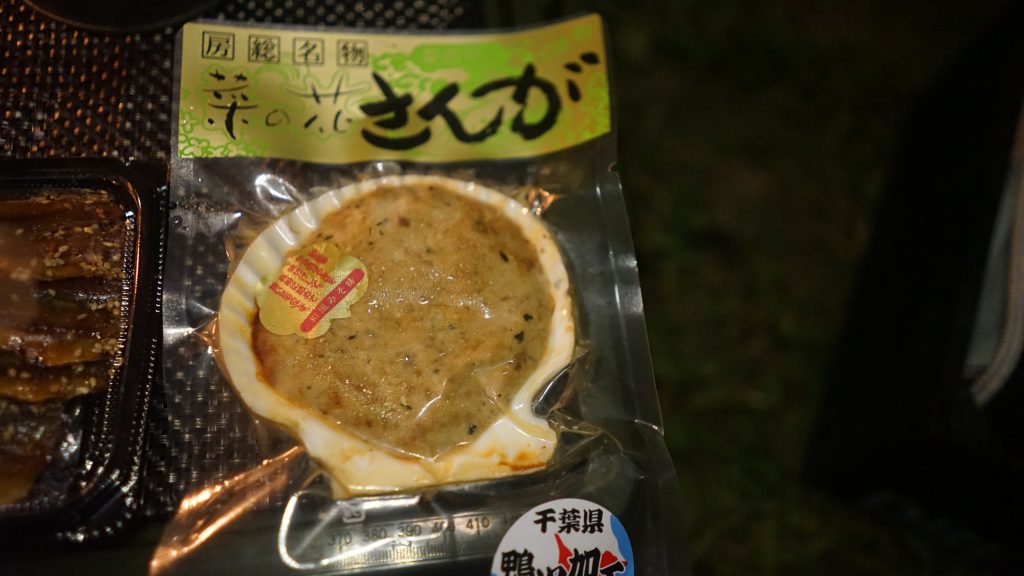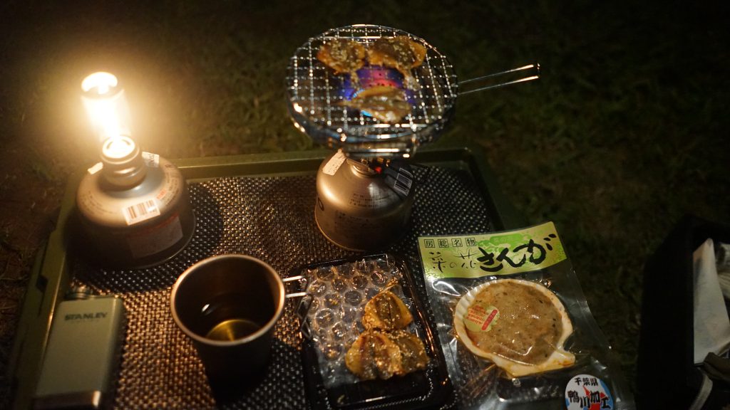 「道の駅鴨川オーシャンパーク」で買った食材を炙って、キャンプ場で酒の「アテ」に(^^♪。