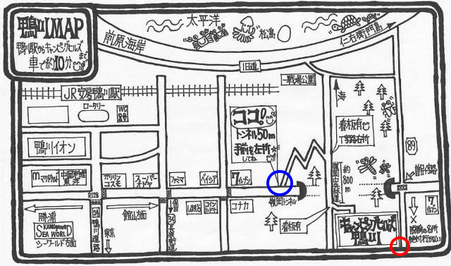↑H.P.にあったキャンプ場近辺の案内地図に、赤丸、青丸を書き足した画像です。鴨川市街から、山の中に入って行きます。