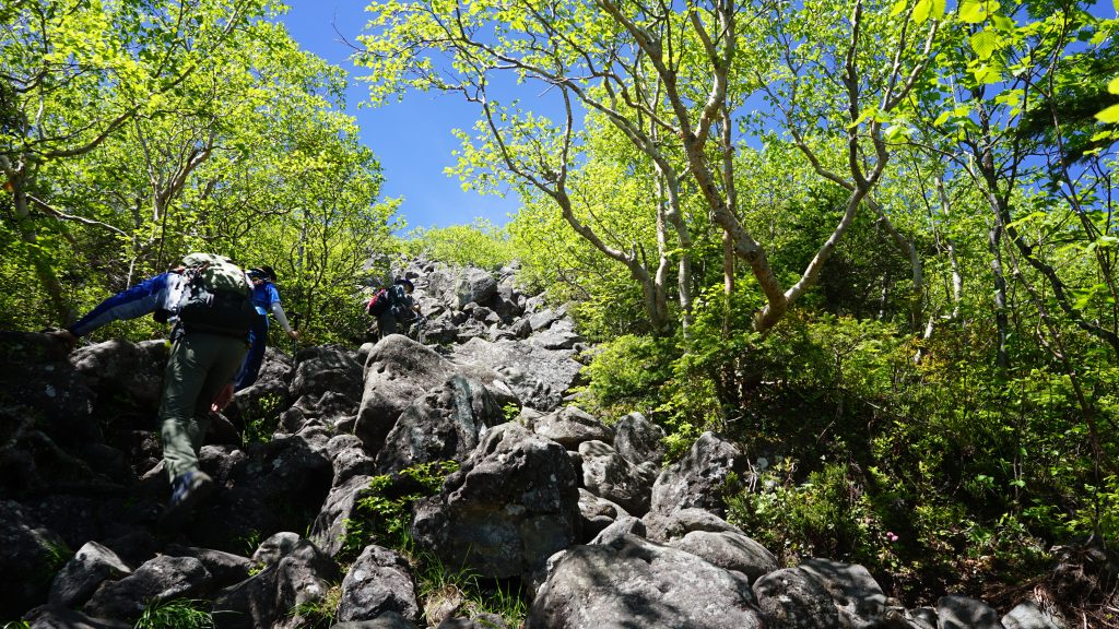ここからは、岩場の急斜面が続きます。写真↑のように、一部鎖場もあり、手をついてよじ登る個所も出てきます。
