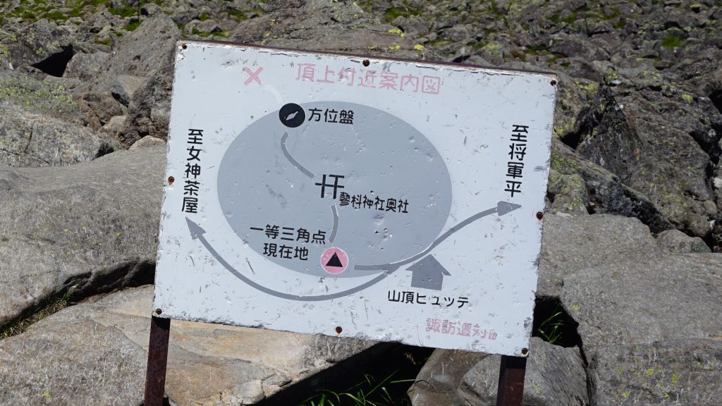 三角点の近くに、案内図もありました。。。蓼科神社奥社と、方位盤を見に行きましょう!