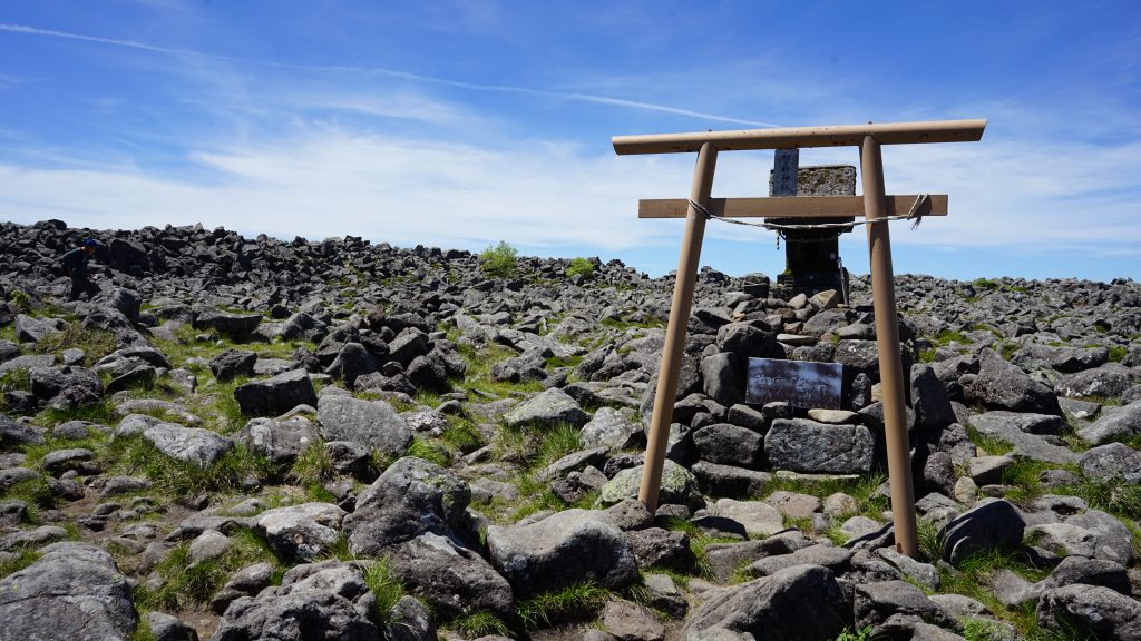 山頂は森林限界を超え、平坦で広く石が積み重なった広場になっており、「蓼科神社」の鳥居があり、祠が祀られています。