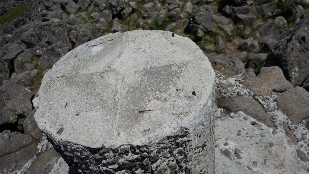 山荘を通り過ぎ、三角点のある山頂を目指します。方向の目印は、地面に黄色いペンキで描かれた矢印と、オレンジのポール。